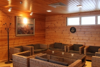 Sivukamari on toisessa kerroksessa Isoon miilu saunan ja takkahuoneen vieressä ja sitä voidaankin käyttää isompiin saunatilaisuus ruokailuihin, pienemmät ruokatilaisuudet onnistuvat takkahuoneessa (kuvassa).